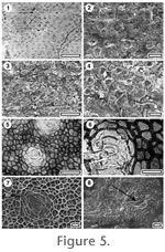 Referred specimens and occurrence: SL1709, Sthd-019; SL2035, Sthd-046. Referred specimens and occurrence: Epidermis not divided into costal and intercostal zones (stomata evenly spread). Stomatal complex construction apparently paracytic, although subsidiary cells not clearly staining more than normal epidermal cells, not in rows, randomly oriented, stomata circular, but not clearly outlined, diameter 14-23 µm (medium). Outer stomatal ledge cuticle markedly thicker than normal epidermal cells, broad in centre and narrowing distinctly toward the ends, with slit-like, elongate aperture. Subsidiary cells each with a single arching ridge of cuticle (Figure 3.3), following the guard cells, but not meeting at the poles. Epidermal cells clearly visible under TLM, isodiametric, sinuous, slightly buttressed, glabrous, not papillate. Identification: Pole (1993b) described Early Miocene leaf impressions from Bannockburn that were indistinguishable from the extant New Zealand Rhipogonum scandens and therefore identified them as the living species. Later, leaves with similar architecture were found with cuticle at the Early Miocene locality of Foulden Hills (Pole 1996). The cuticle details confirmed the identification (but note that figures 11c, d in Pole 1996 inadvertently lack captions. They are of extant Rhipogonum scandens). The specimens in this study are dispersed cuticle only, and without the benefit of leaf architectural a broader range of possibilities must be considered for identification. The Rhipogonaceae and Smilacaceae are two of the "net-veined" monocots (Inamdar et al. 1983) and as such, they do not have stomata and epidermal cells arranged in rows like parallel-veined monocots. However, they both have similar epidermal features which makes them clearly recognisable, although hard to tell from one another. Both have paracytic stomatal complexes where the subsidiary cells are generally slightly thicker than normal epidermal cells, of uneven size, and with an irregular outer wall, and the epidermal cells are highly sinuous. The dispersed fossil material clearly fits this basic morphology. Based on the species available in the extant reference collection (seven species of Rhipogonum and nine of Smilax), in general, Smilax species tend to have thin, or poorly defined epidermal cell anticlinal walls, poorly defined margins to generally elliptical stomata which are 20-35 µm in greatest diameter (medium-sized). In contrast, Rhipogonum tend to have much stronger or clearly defined epidermal cell anticlinal walls, and well-defined margins to generally circular stomatal which are 28-43 µm in diameter (from medium to large) (see Figure 3.7-3.8). The new fossil is consistent with Rhipogonum, although there are subtle, but consistent differences with the R. scandens (Figure 3.5). In the fossil, the pair of ridge-arcs flanking the stomata is more prominent, and the stomata are slightly smaller. Without leaf architectural details it is inadvisable to place the dispersed cuticle fragment into an extant species. Very similar cuticle is also present in the Early Eocene of Regatta Point, Tasmania.