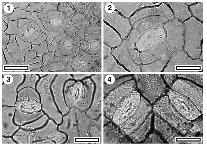 Figure 7. Fossil and extant Gnetales. 1. CUT-Z-GDB. TLM view showing five stomatal complexes (SL5298, scale-bar = 50 µm); 2. CUT-Z-GDB. TLM detail of a single stomatal complex. Note the much thinner cuticle over the guard cells (SL5298, scale-bar = 20 µm); 3. Extant Gnetum gnemon (AQ142124, scale-bar = 20 µm); 4. G. microcarpum (AQ142225, scale-bar = 20 µm).